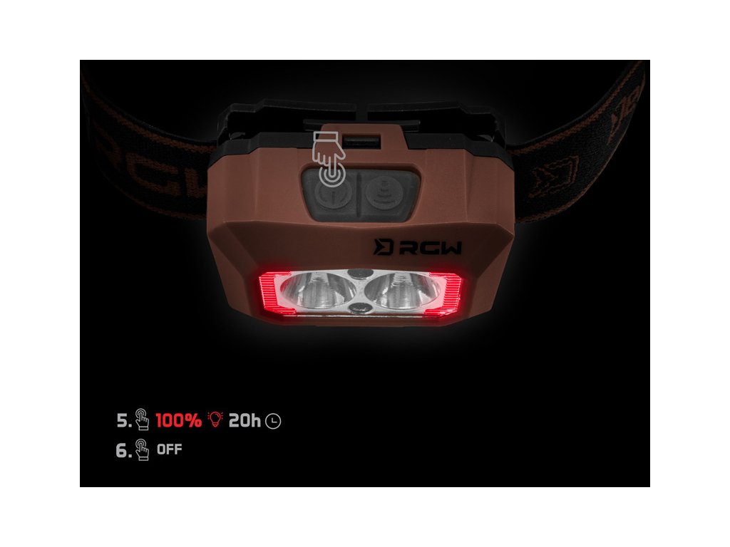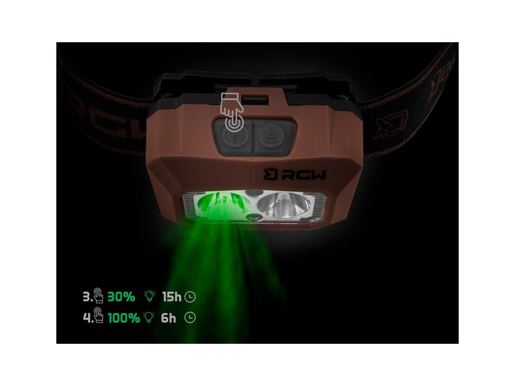 Po druhom kliknutí svieti na 100% s výdržou 4h. Pri treťom kliknutí sa zmení farba svietenia na zelenú s intenzitou 30% a excelentnou výdržou až 15h. Po 4. kliknutí svieti zelené svetlo na 100% a pri 5. kliknutí sa na 100% rozsvieti svetlo červené. Práve zelené a červené svetlo nepriťahuje otravný hmyz a rozhodne ho oceníte aj počas zdolávania rýb, ktoré sa plašia omnoho menej ako pri osvietení bielym svetlom. Senzor pohybu je možné aktivovať pomocou druhého tlačidla a na rozsvietenie lampy tak stačí pred ňou zamávať dlaňou. Nespornou devízou je taktiež indikácia kapacity batérie, ktorá sa na čelovke rozsvieti pri dlhšom podržaní spínacieho tlačidla. Batériu s kapacitou 1500 mAh je možné nabíjať cez USB-C kábel, pričom plné nabitie trvá 4,5h.