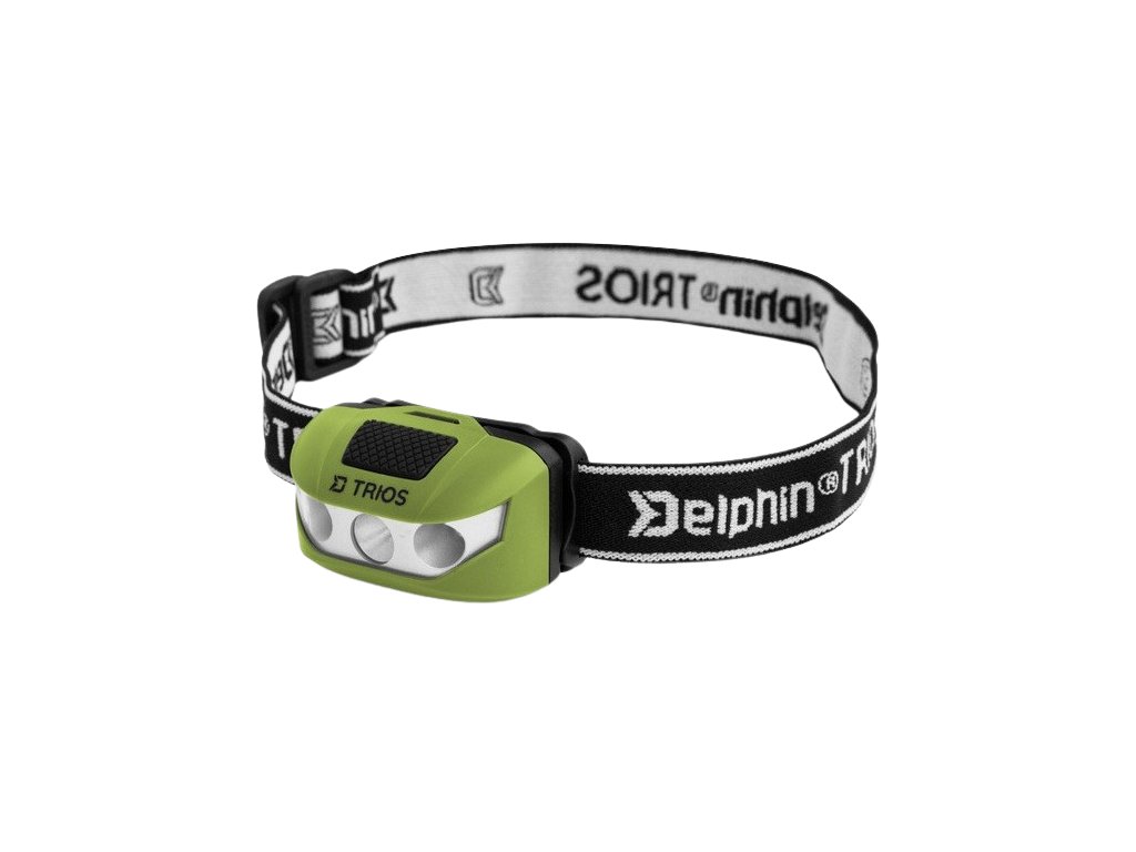 Samotné telo lampy je umiestnené na elastickom popruhu s vyobrazením loga Delphin a s názvom TRIOS. Lampa sa zapína masívnym čiernym vypínačom na vrchnej časti čelovky. Čelovka 3 úrovne bieleho svietenia. Po jednom kliknutí svieti lampa 70% výkonom a vydrží 5 hodín, po druhom kliknutí svieti 100% výkonom a vydrží svietiť 3,5h, po treťom kliknutí svieti na 30% a výdrž batérie sa predlžuje až na 12 hodín. Dlhším podržaním tlačidla aktivujete červené bočné diódy, ktoré môžu svietiť, blikať, alebo vydávať signál SOS.