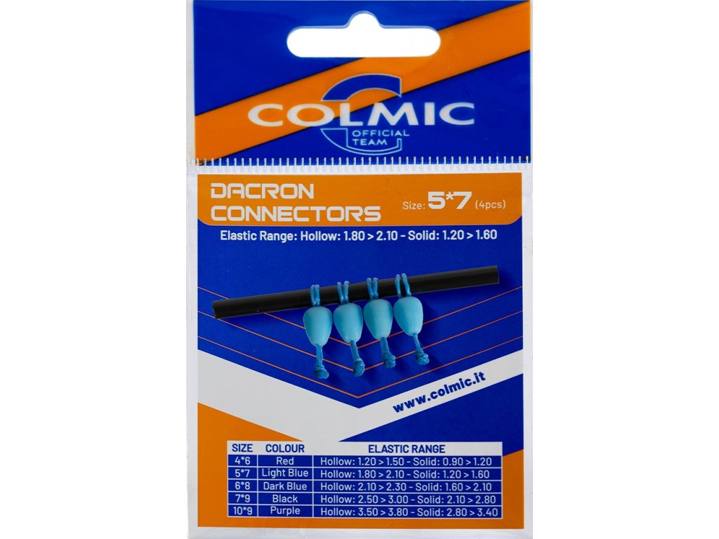 Konektory COLMIC DACRON sú dostupné v rôznych veľkostiach a sú vyrobené z vysoko kvalitnej gumy a dajú sa prispôsobiť akémukoľvek priemeru elastického materiálu. Sú robustné a odolné, sú štandardom pre tento typ príslušenstva.
