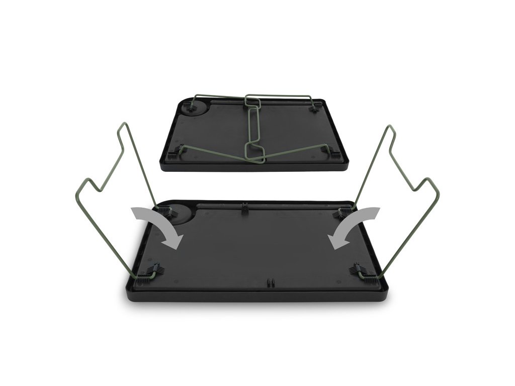 Stolík disponuje sklápateľnými nohami, vďaka čomu po ich zložení nadobúda veľmi kompaktné transportné rozmery. Praktické úchyty na spodnej strane dosky zabezpečujú fixáciu nôh v rozloženom aj zloženom stave, čím predchádzajú ich nechcenému pohybu počas manipulácie alebo prepravy.